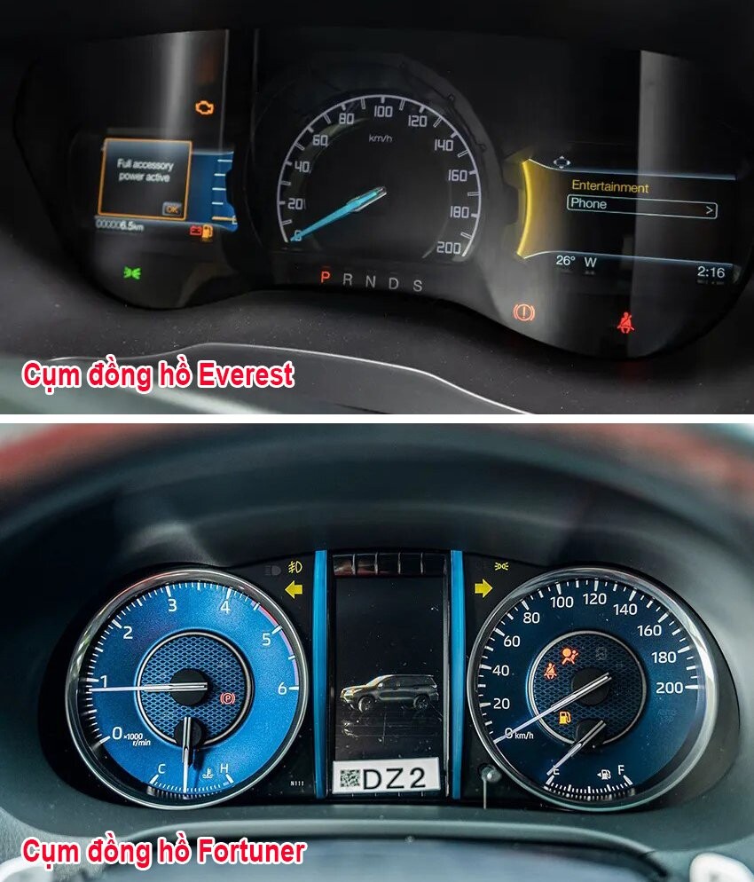 Cụm đồng hồ ở 2 mẫu xe cũng được thiết kế theo 2 phong cách riêng. Nếu ở Fortuner là kiểu 2 vòng đồng hồ 2 bên và 1 màn hình đa thông tin chính giữa, thì Everest thì ngược lại, phiên bản này có 2 màn hình 2 bên và 1 đồng hồ chính giữa. Nhưng tựu chung, về cơ bản thì các cụm thiết bị này đều cung cấp đầy đủ các thông tin hữu ích để hỗ trợ người lái.